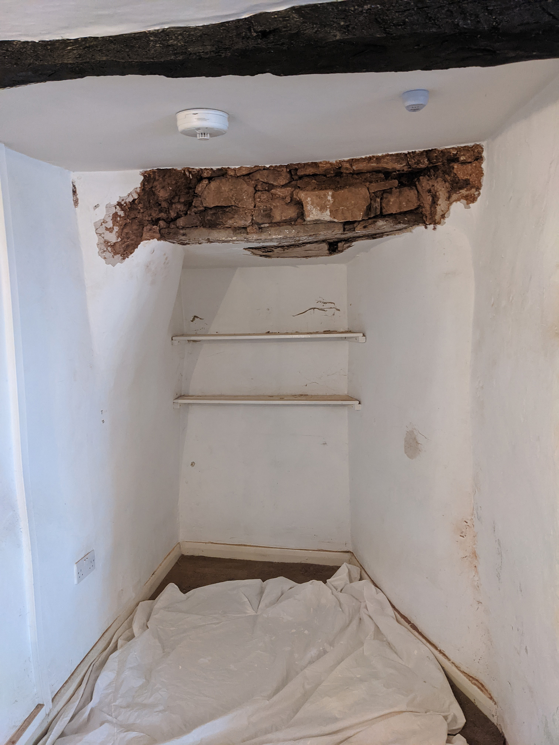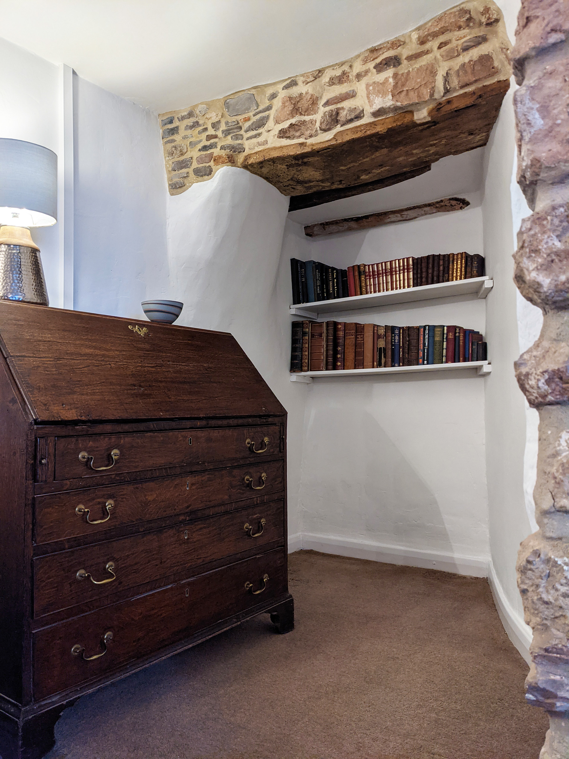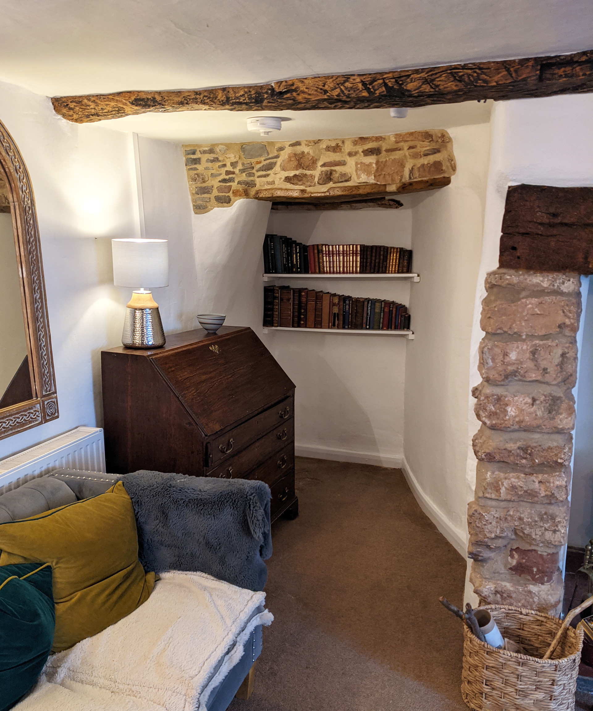Cracks in a bricked-in doorway revealed an ancient wooden lintel sagging under the weight of stone, cob and rubble, which I quickly removed. I stabilised and strengthened the lintel, which became a feature, and refilled the space above using the original stone and a lime mortar mix. I also exposed other beams, stripping one of its many layers of black paint.