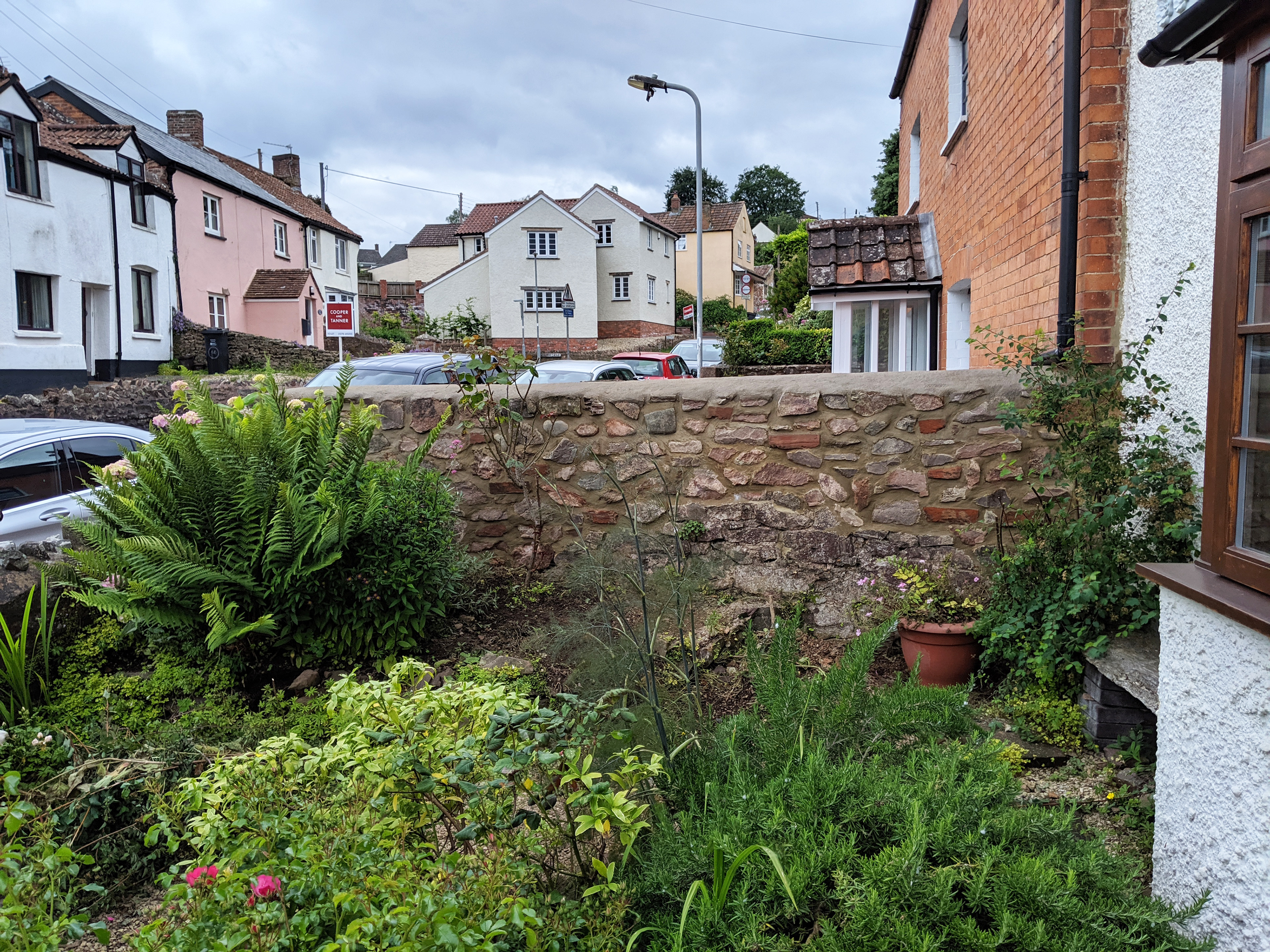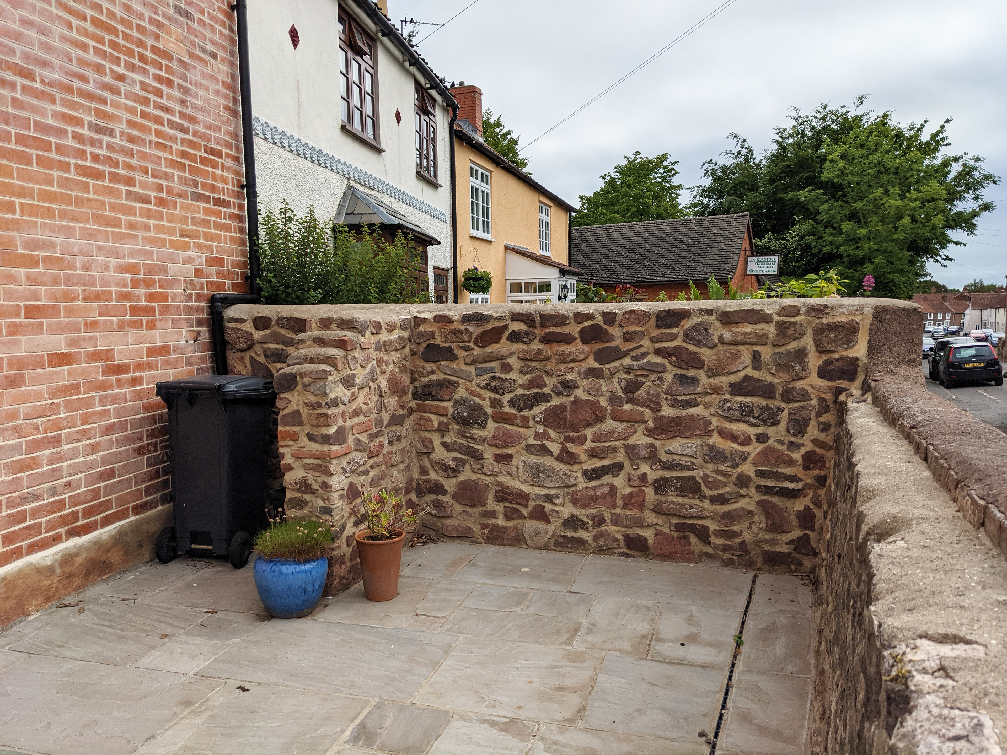 This garden wall was unstable and likely to collapse at any point. As part of rebuilding it, I added a buttress for extra stability; it also acted as a shield for the bins, as the cottage is terraced with no rear access.