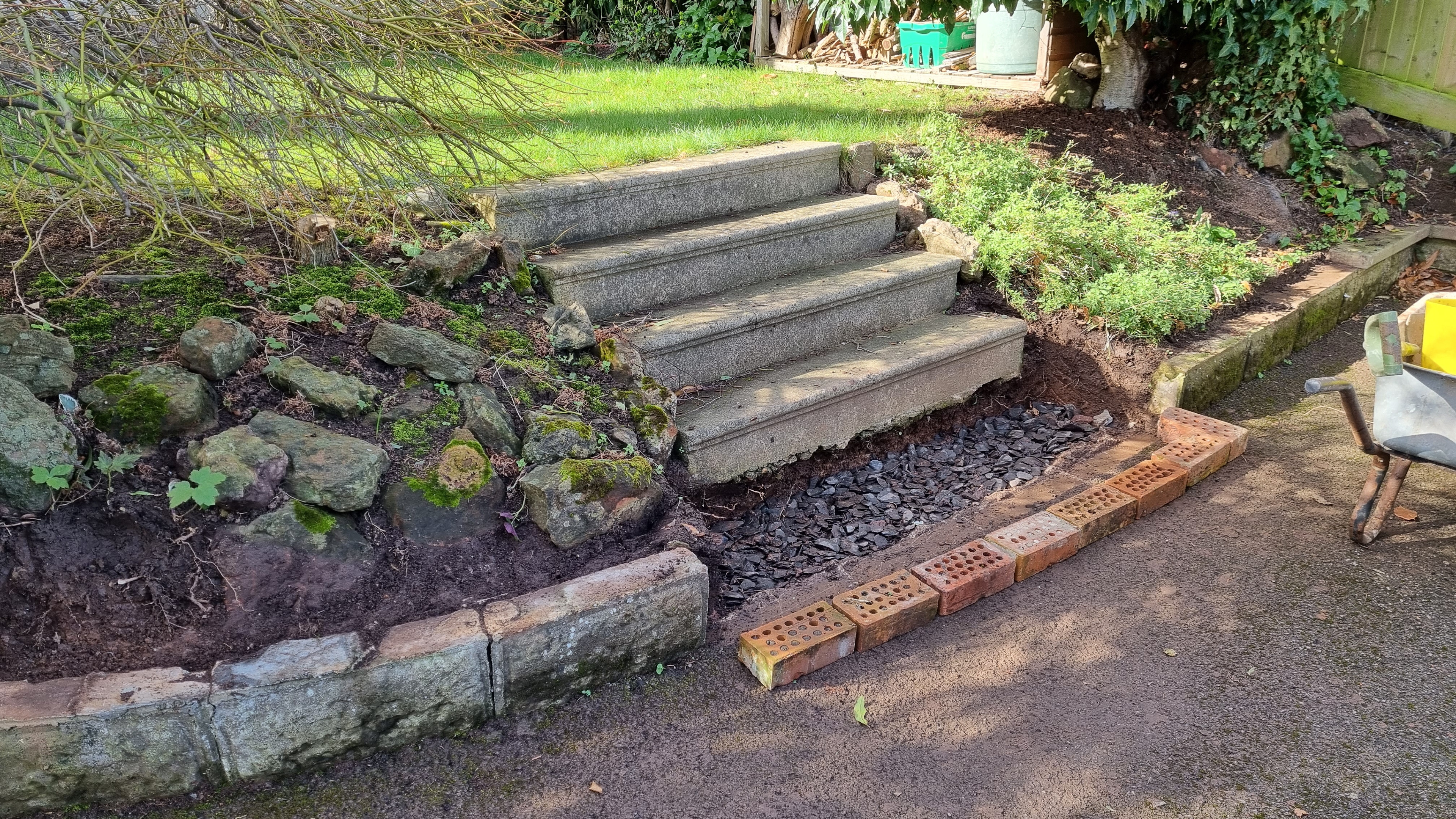 These Victorian garden steps had been missing the lower one for as long as anyone could remember, replaced with tarmac extending to the driveway. I built a new step, using bricks and stone to style it into the adjoining walls.